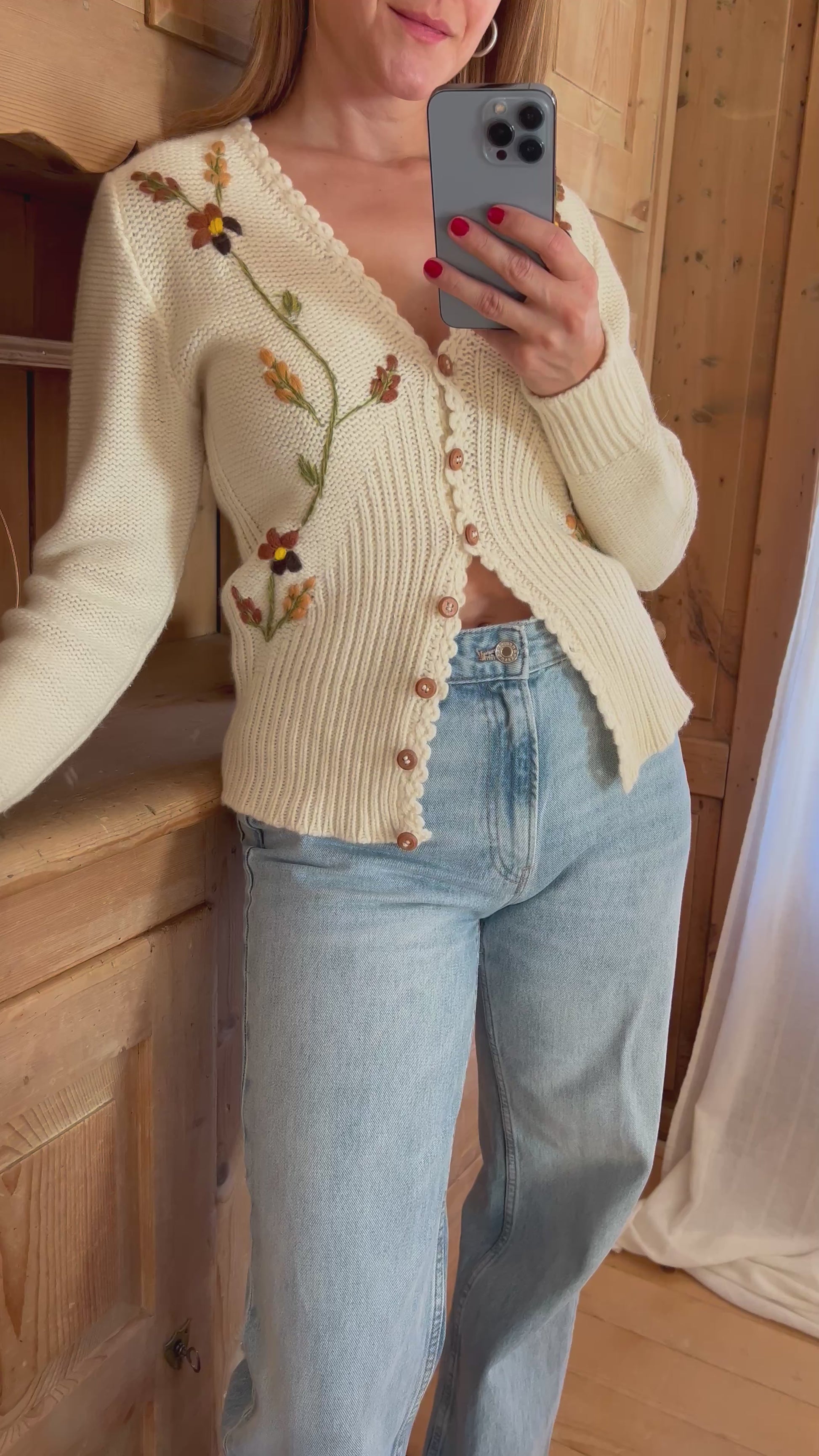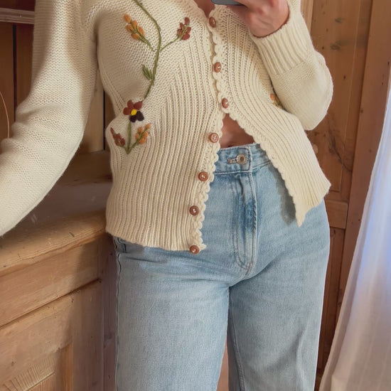 Embroidered beige cardigan. Features autumn inspired embroidery and cute wooden buttons.