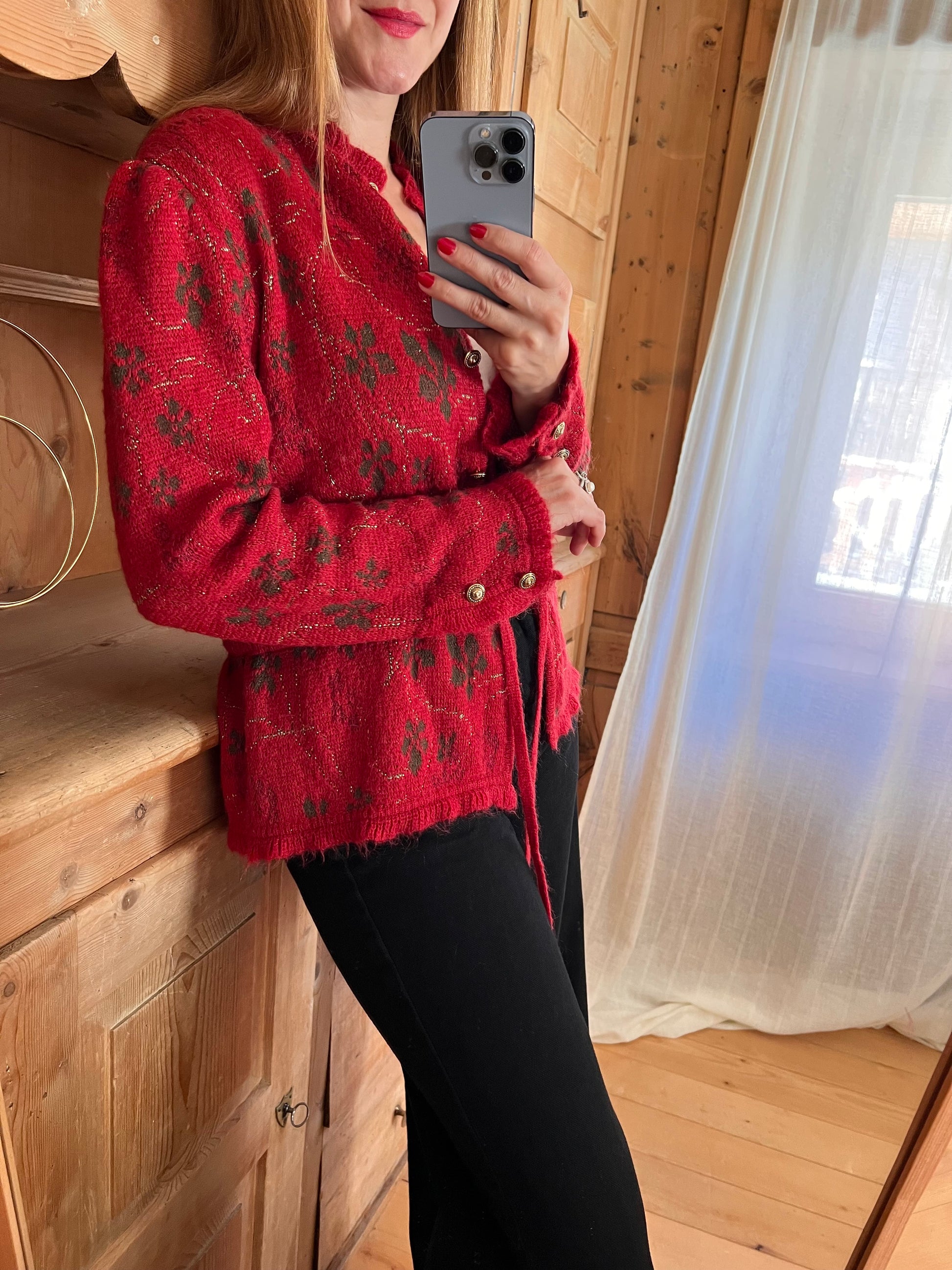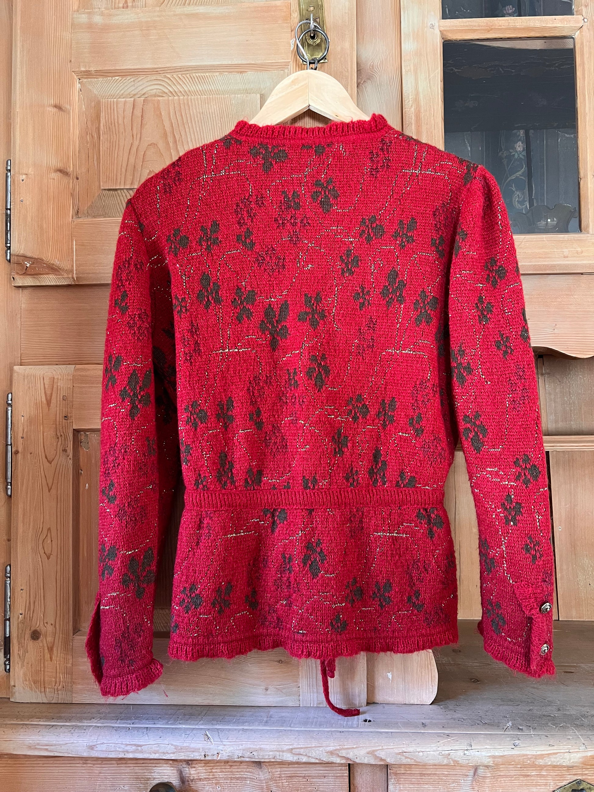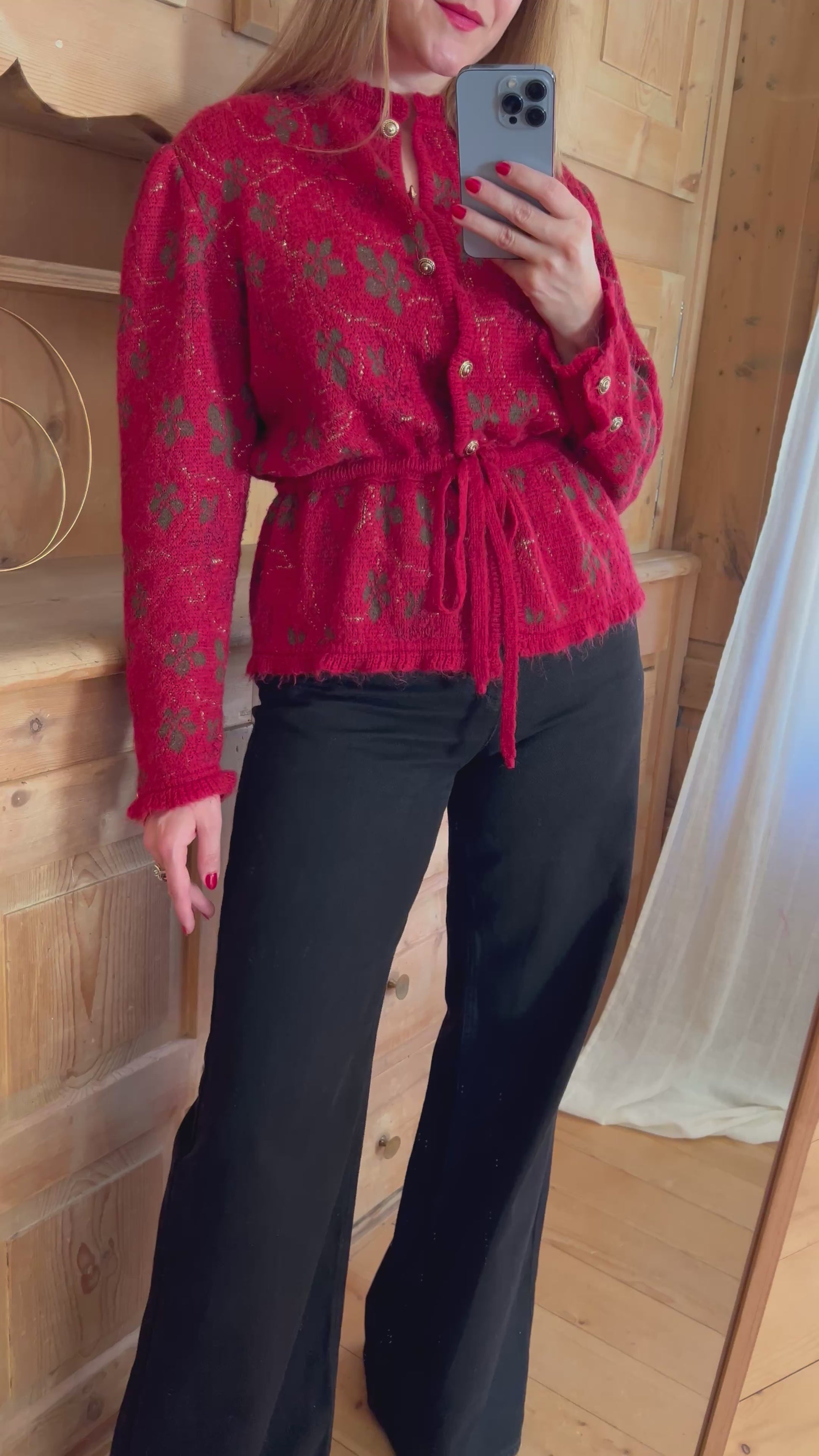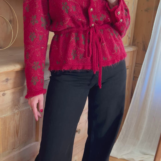 Mohair cardigan in red. Features subtle puff sleeves, beautiful buttons, adjustable waist and golden thread through.