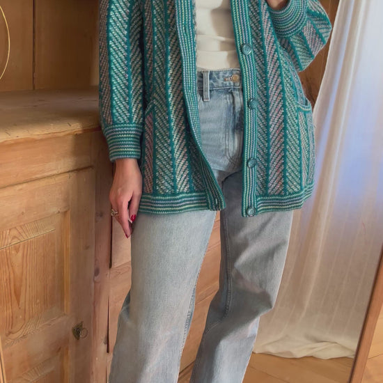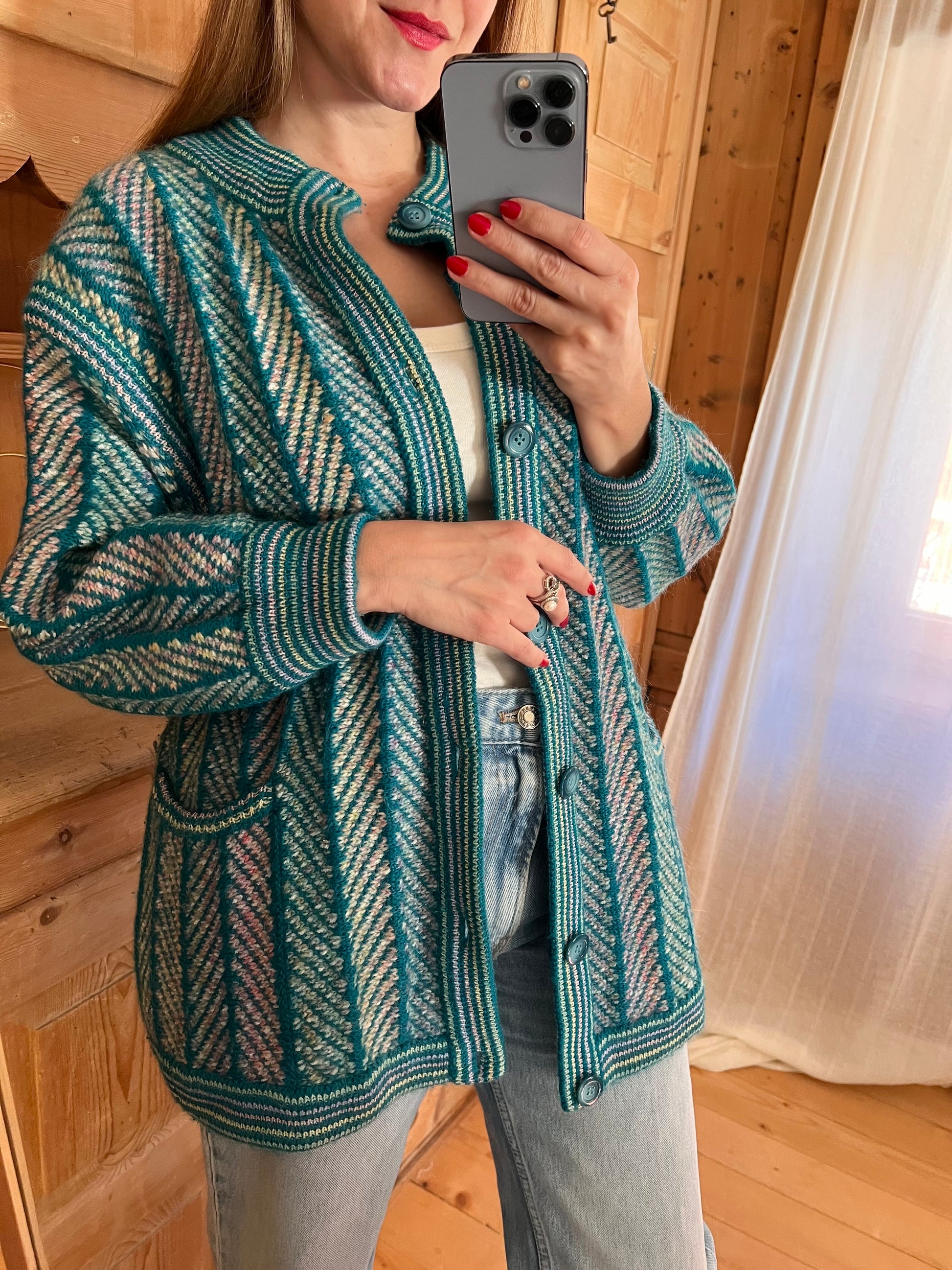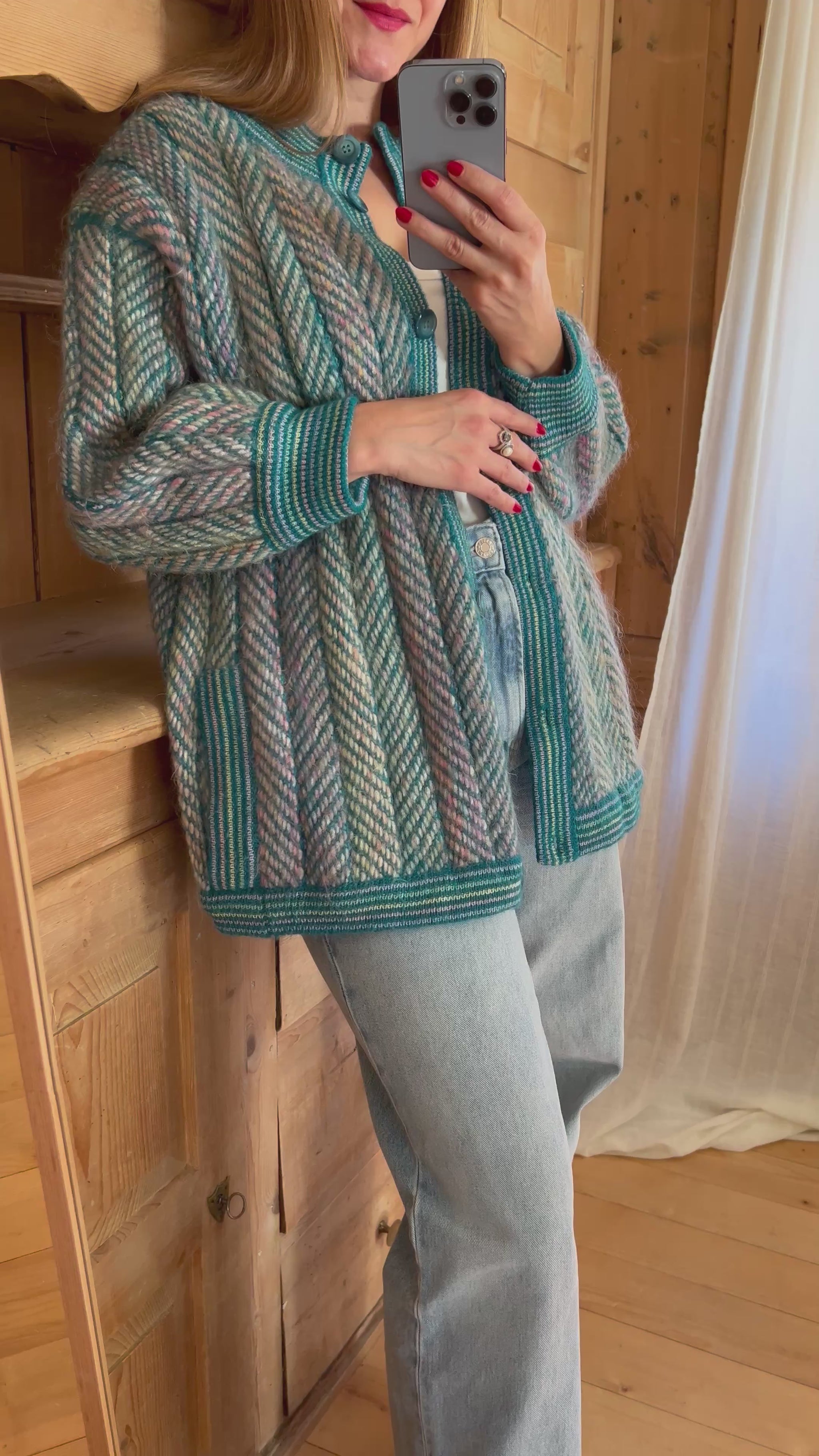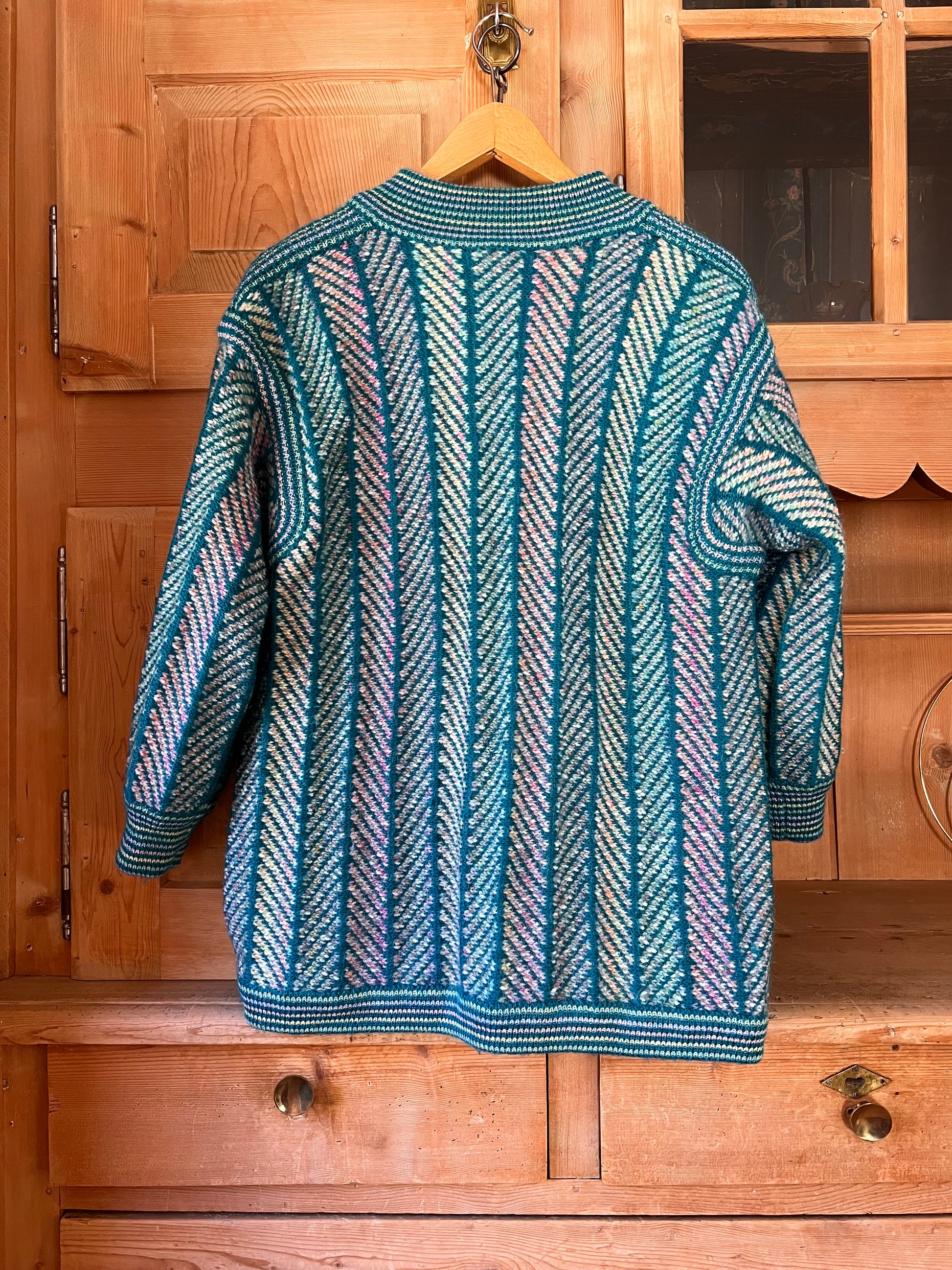 Stunning reversible wool jacket/cardigan. Warm and soft. Features two pockets in both sides. Buttons in full length and beautiful pattern.