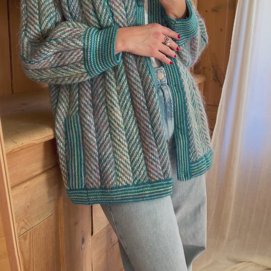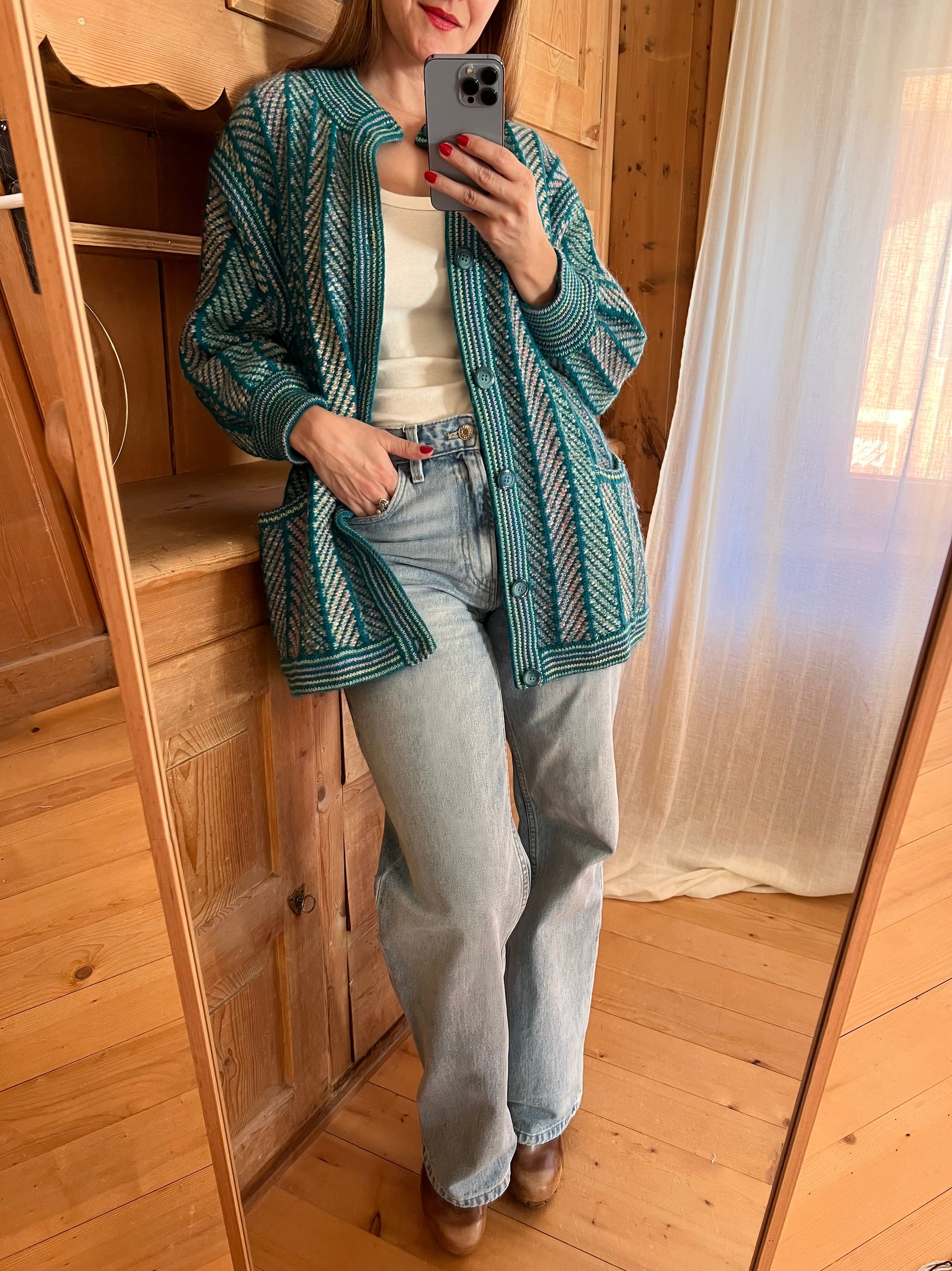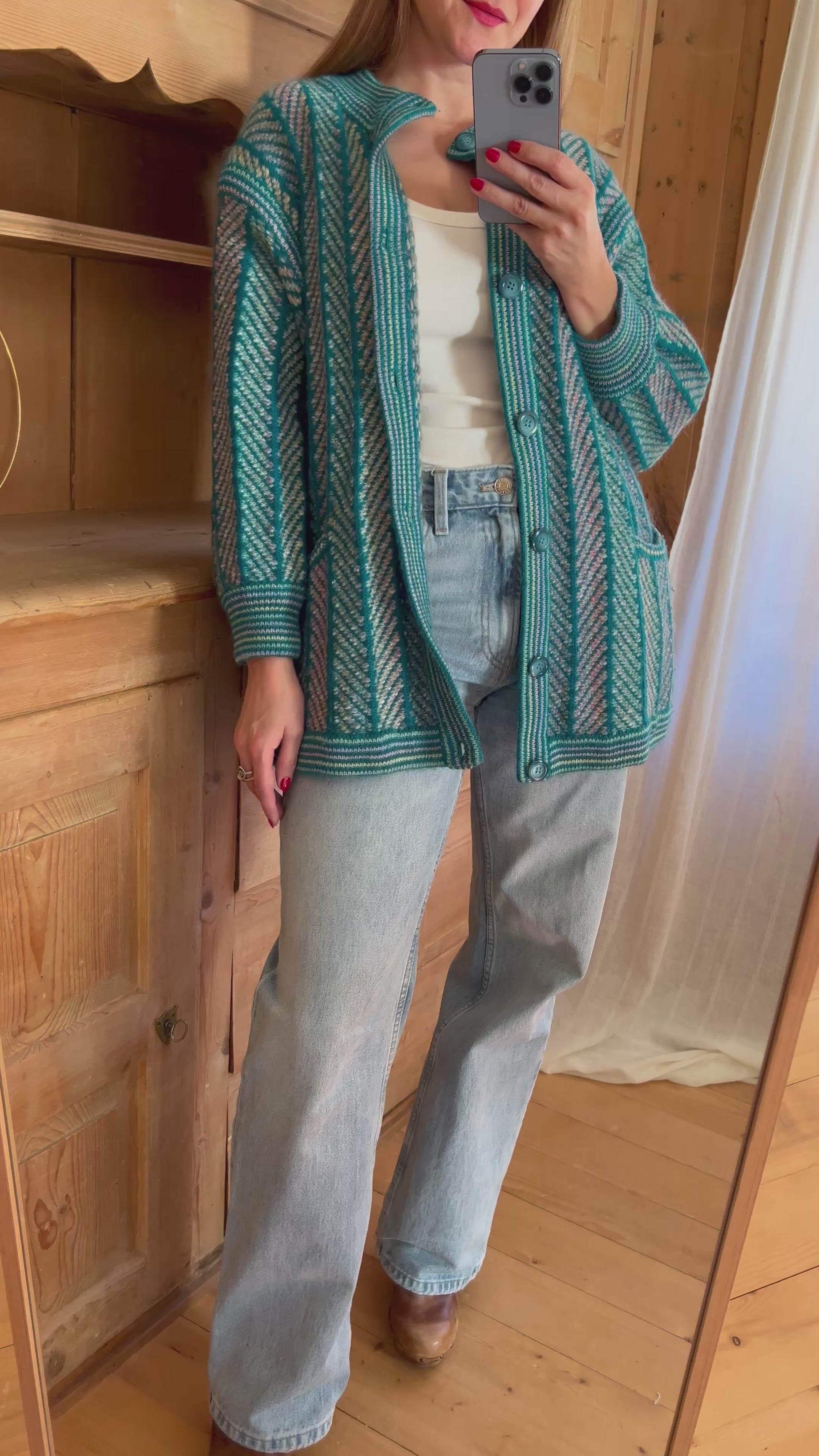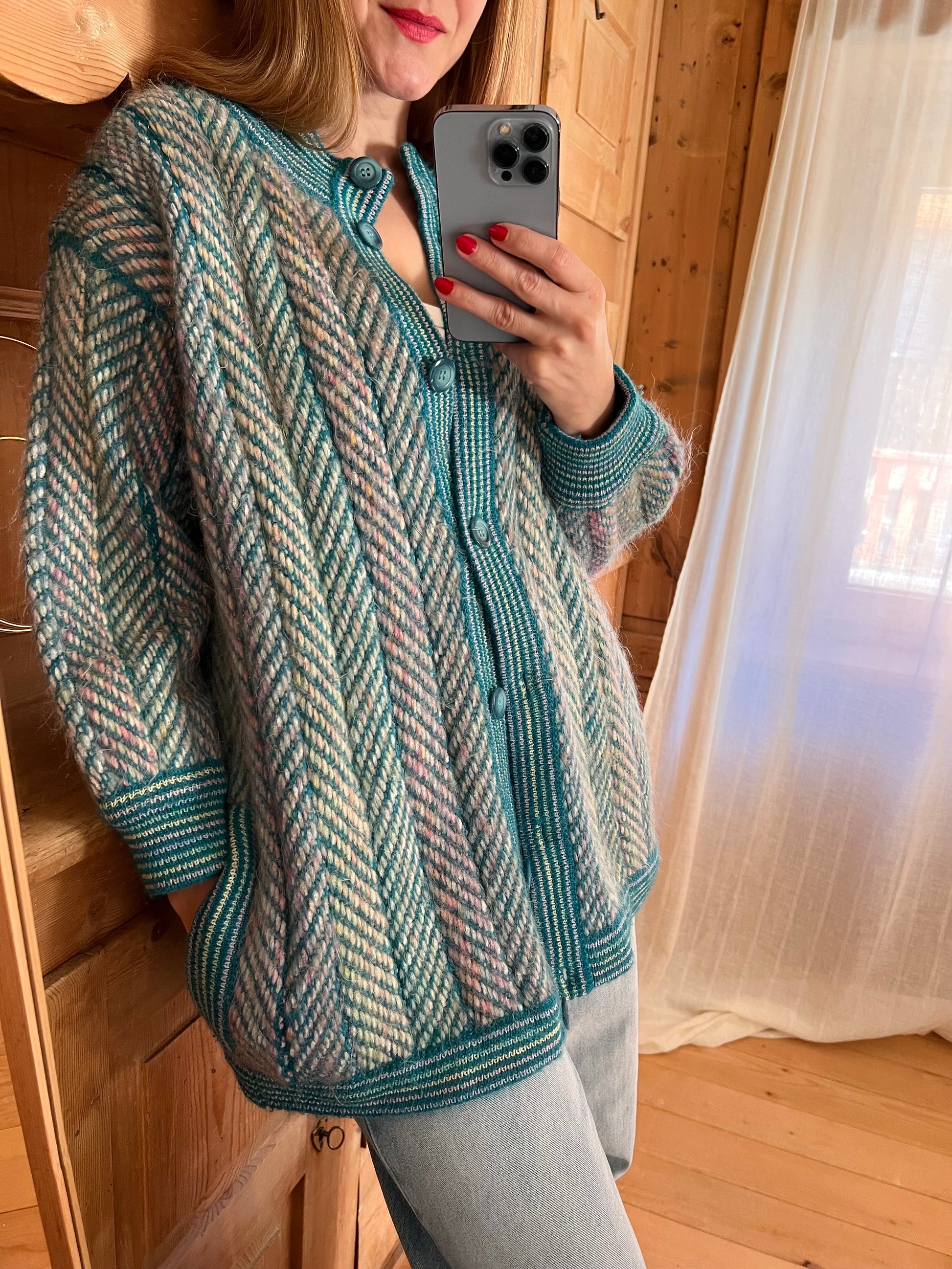 Stunning reversible wool jacket/cardigan. Warm and soft. Features two pockets in both sides. Buttons in full length and beautiful pattern.