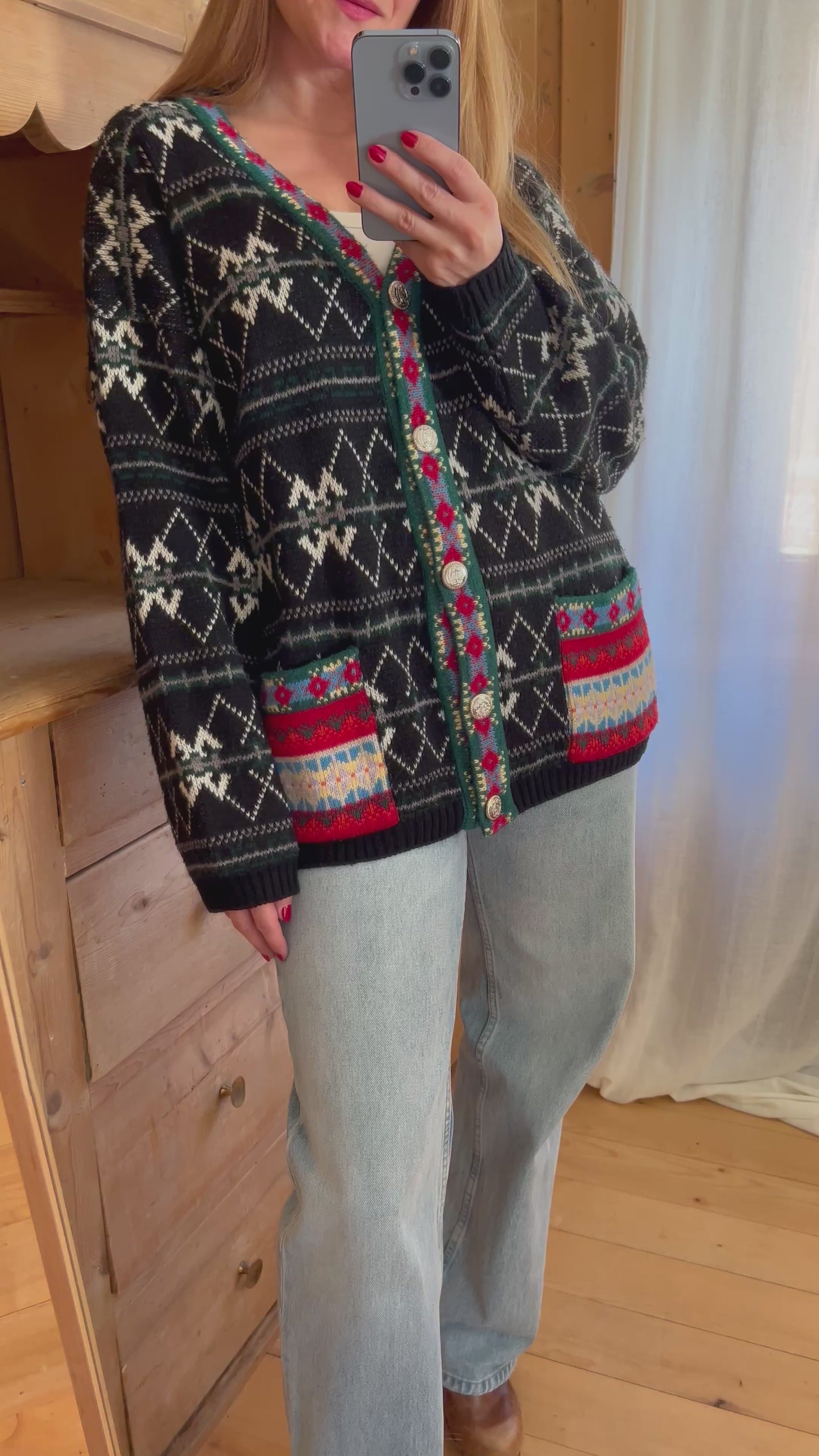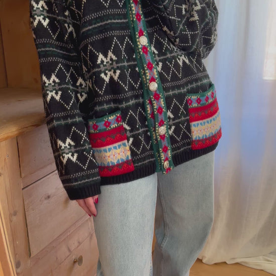 Vintage cardigan. It Features beautiful pattern combination and two front pockets.