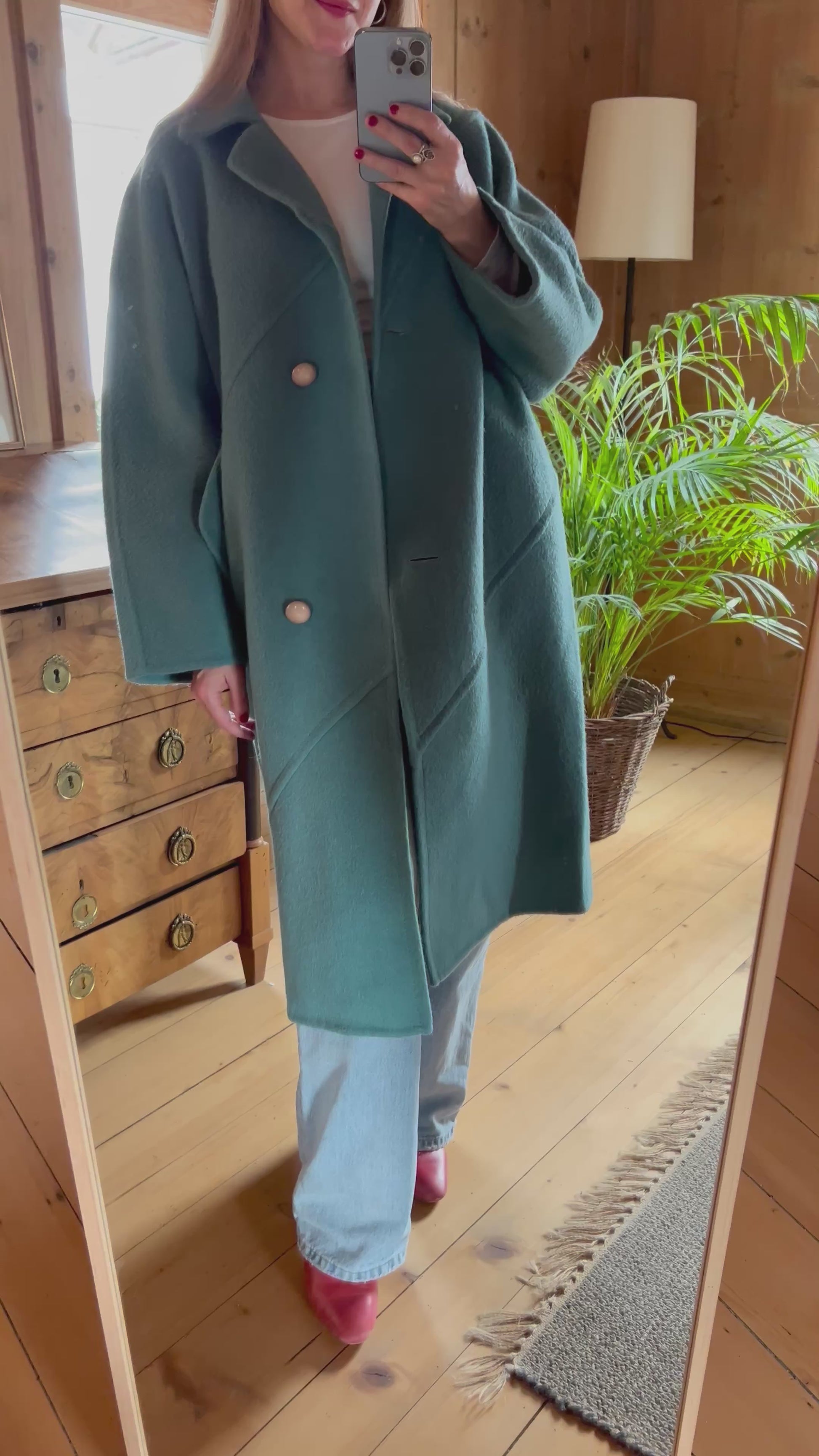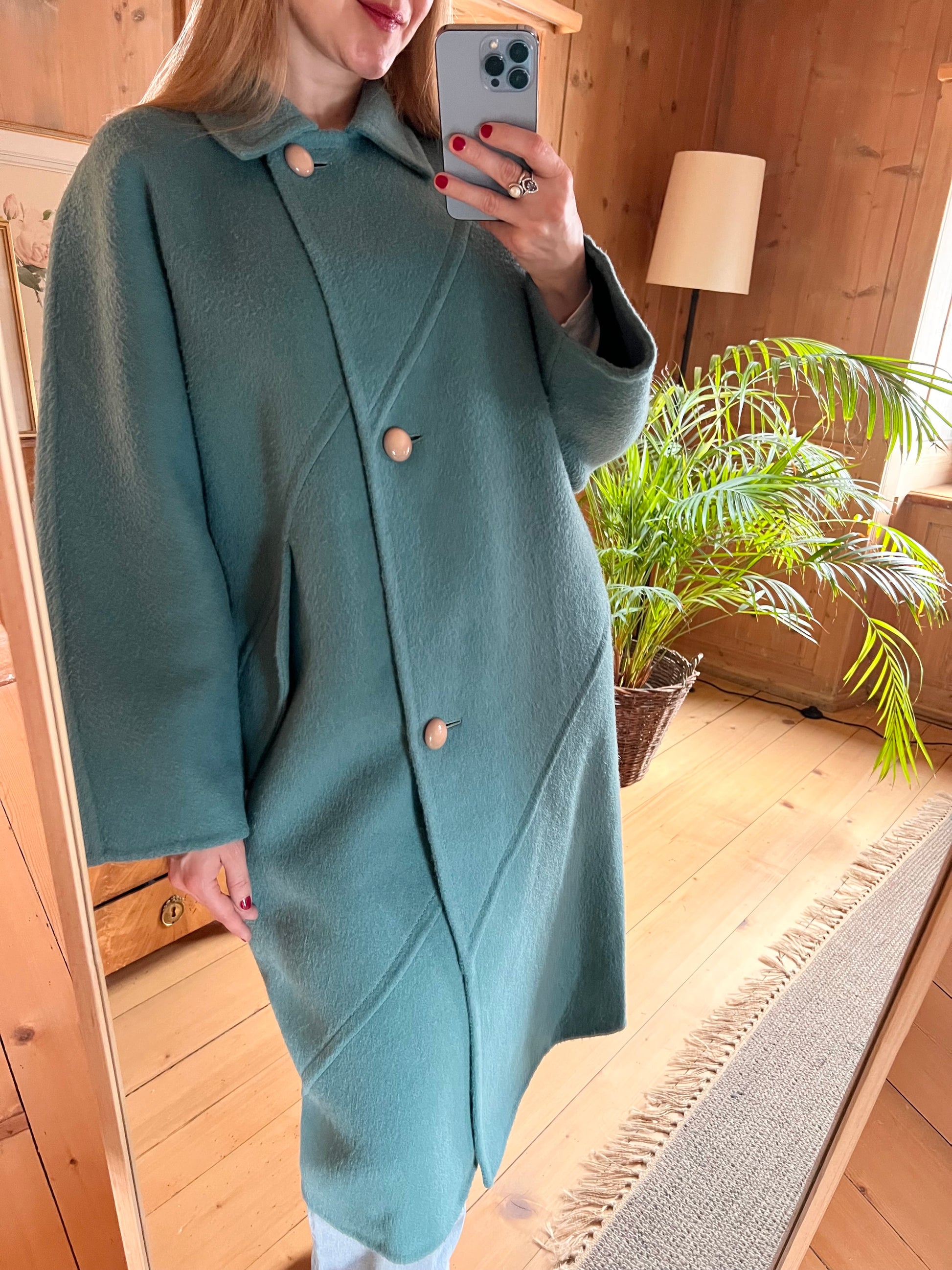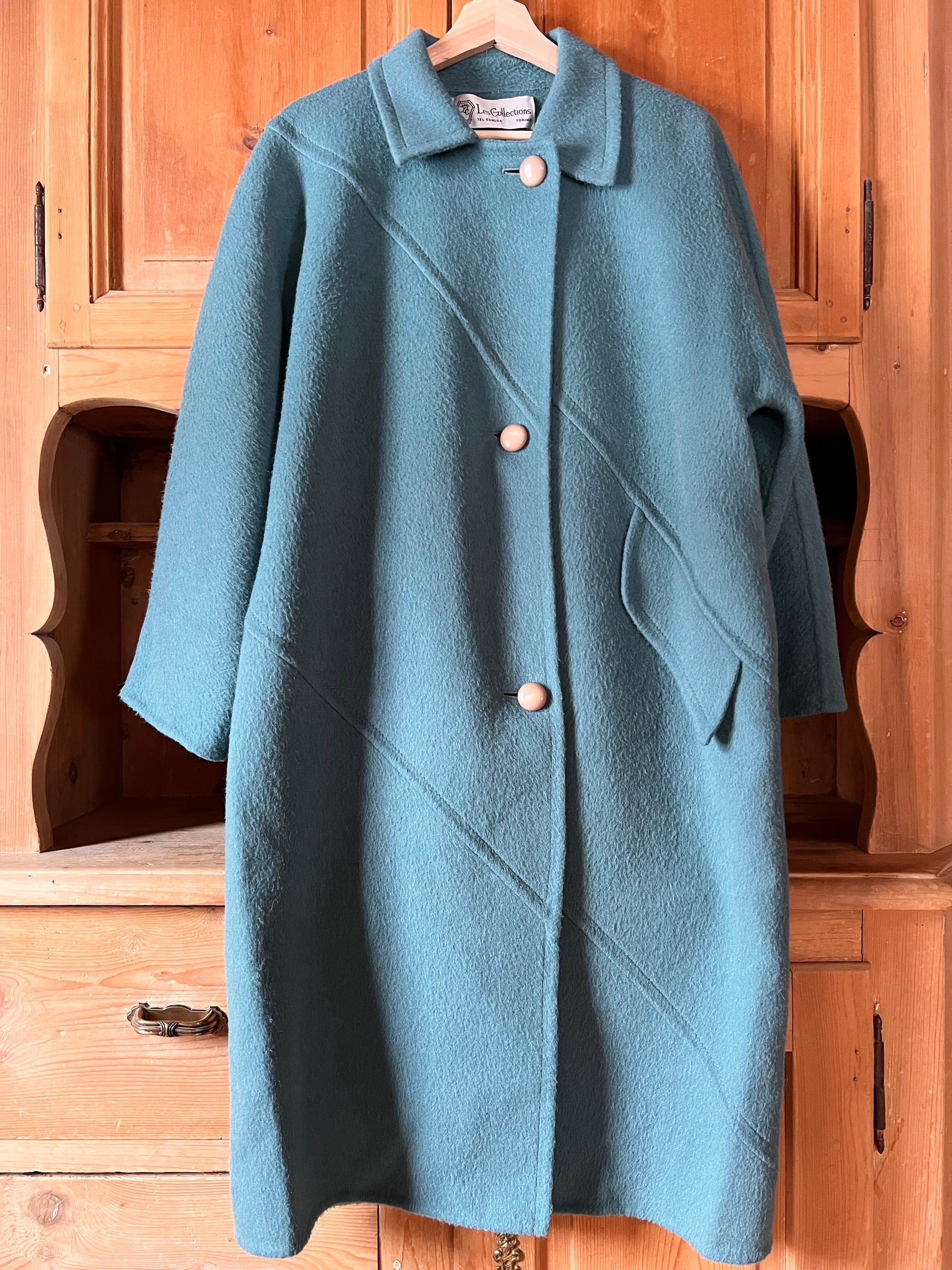 A beautifully hand tailored lightweight blue coat in soft alpaca/wool blend. It features relaxed cut and slightly oversized silhouette.
