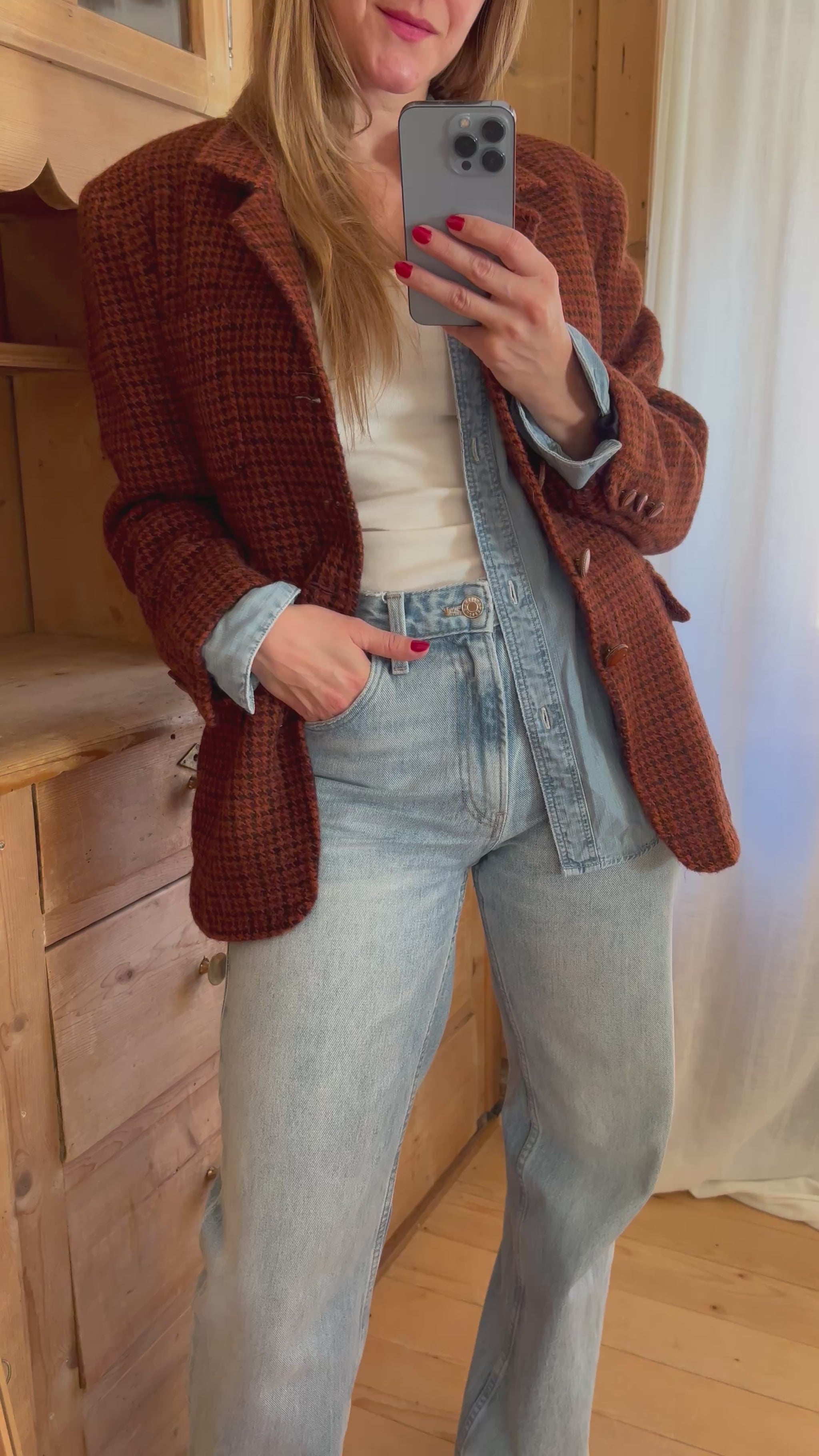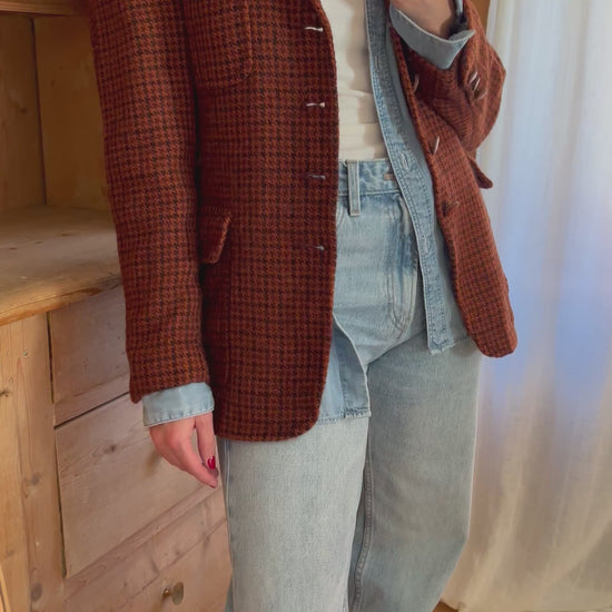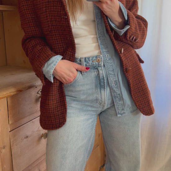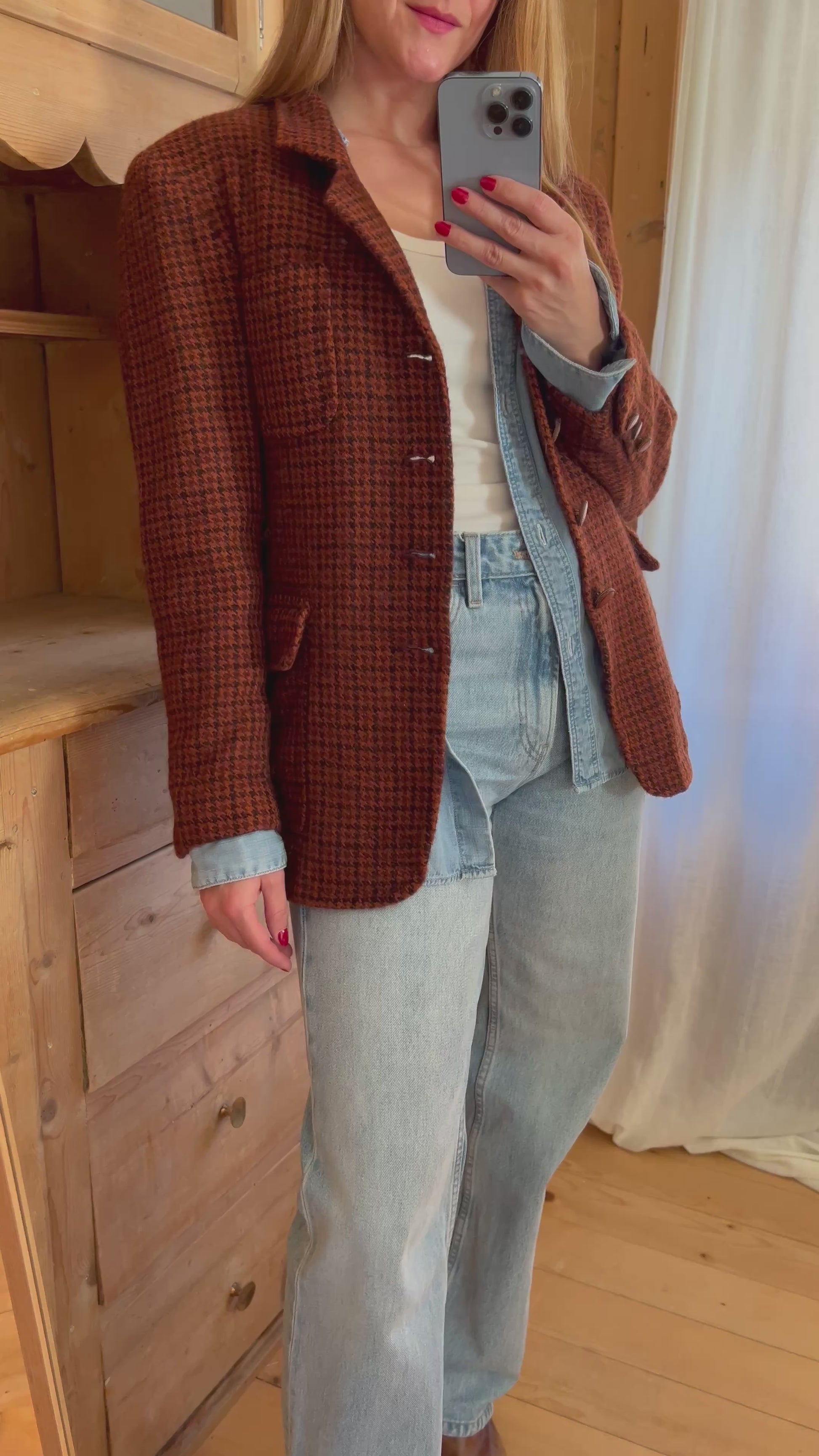Vintage wool blazer. In gorgeous autumnal palette. Features shoulder pads, front pockets and adjustable waist.