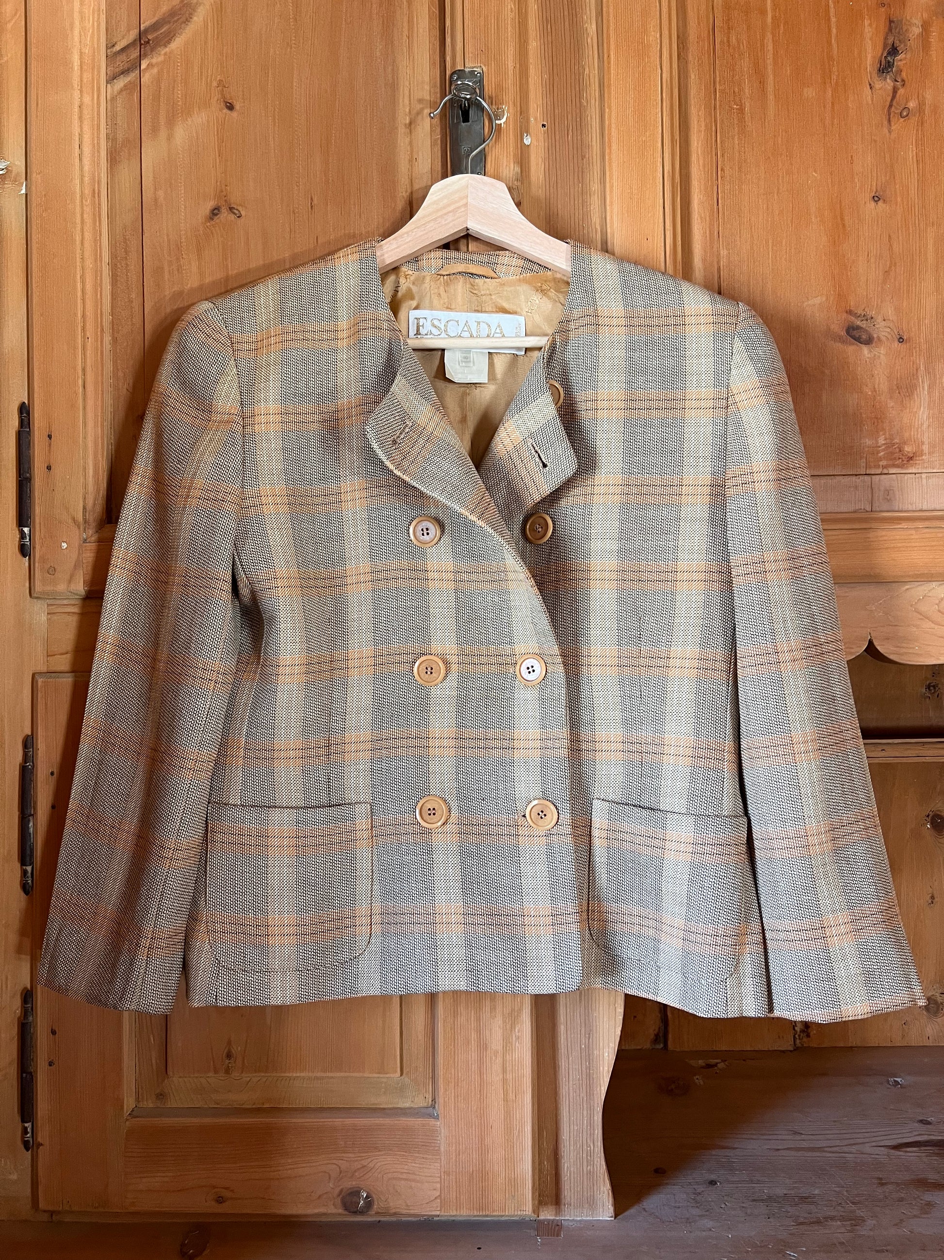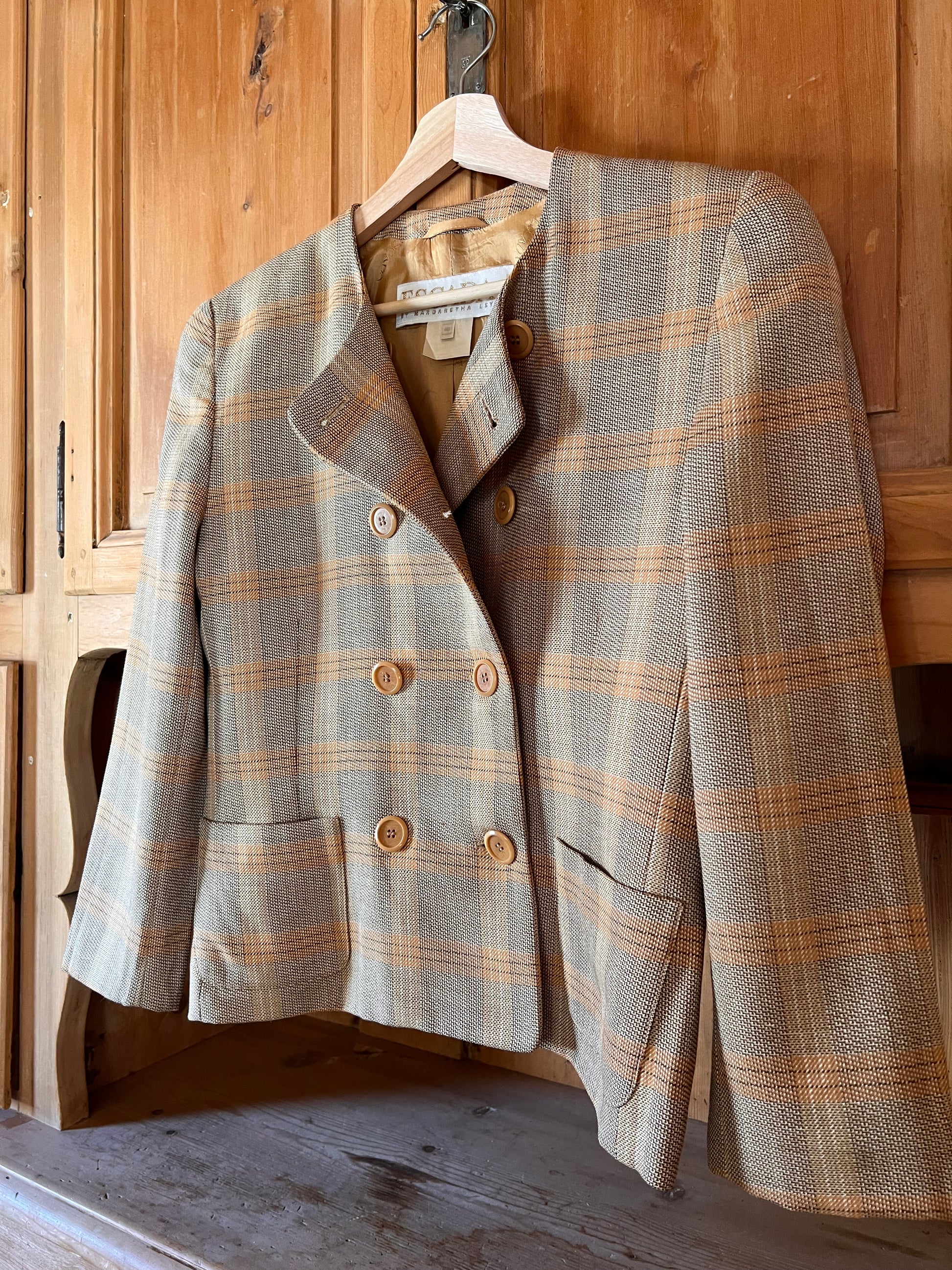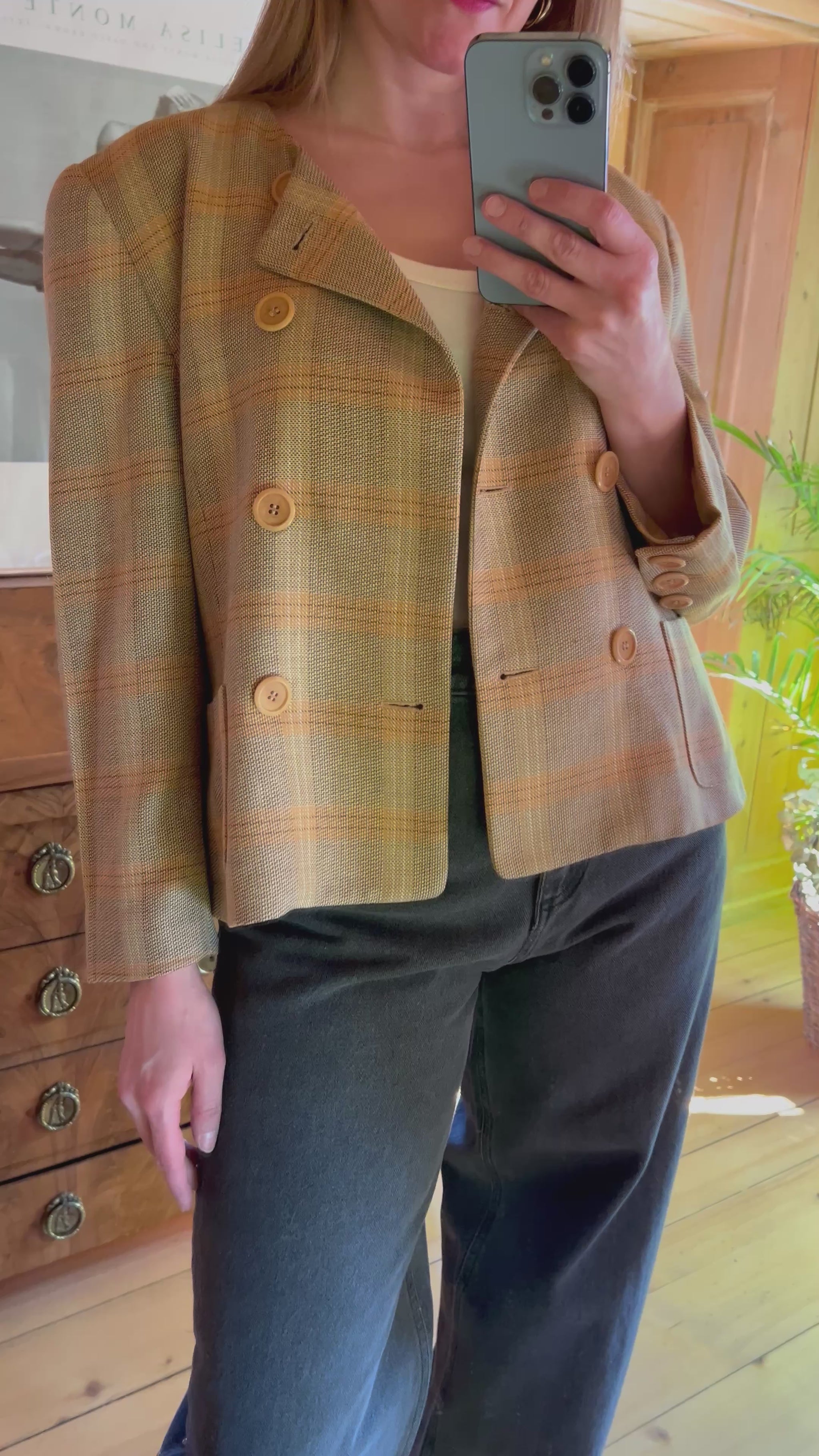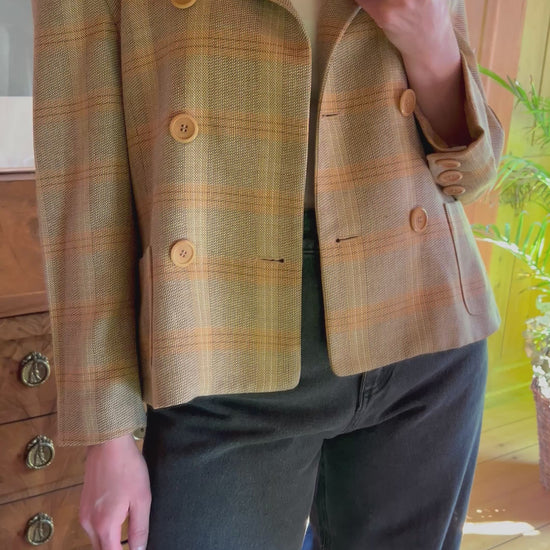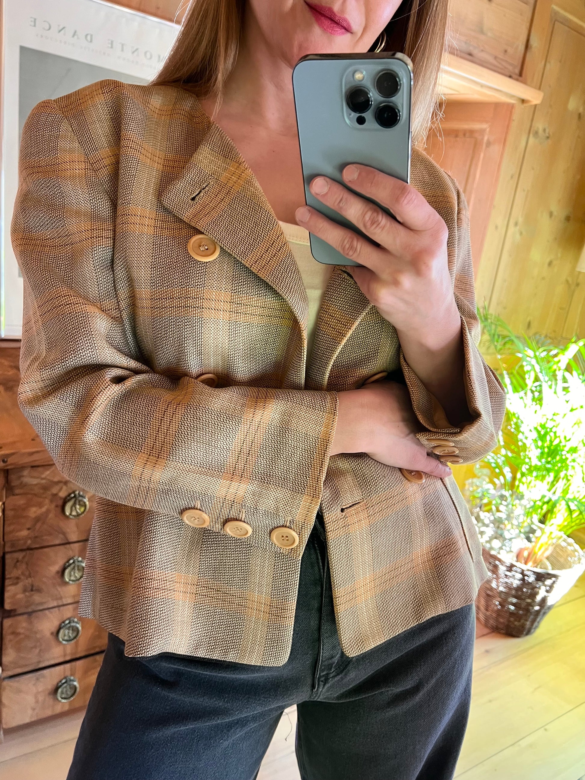 Wool checkered, slightly cropped blazer in a soft beige palette. Featuring structured shoulder pads and two front pockets.