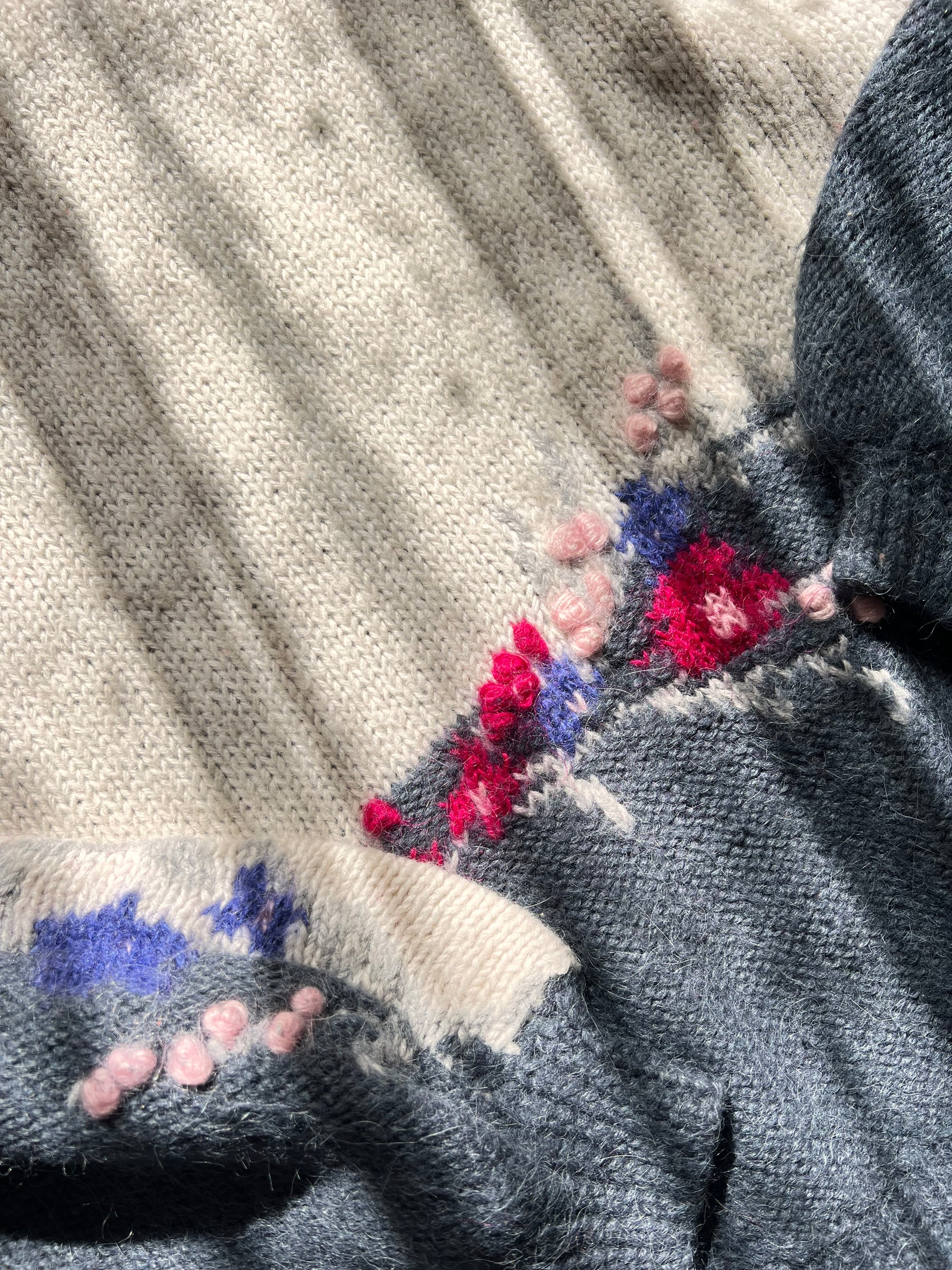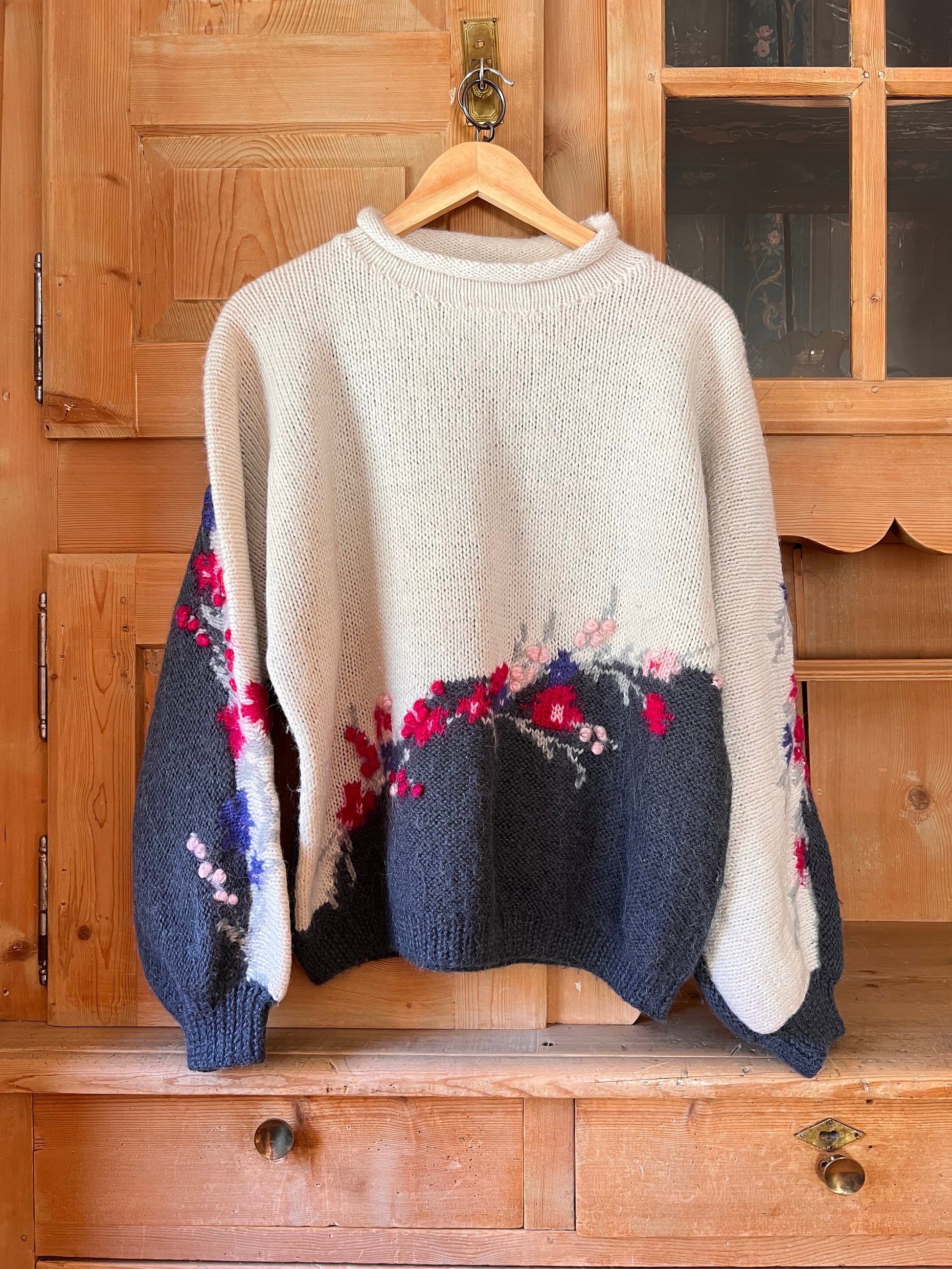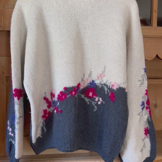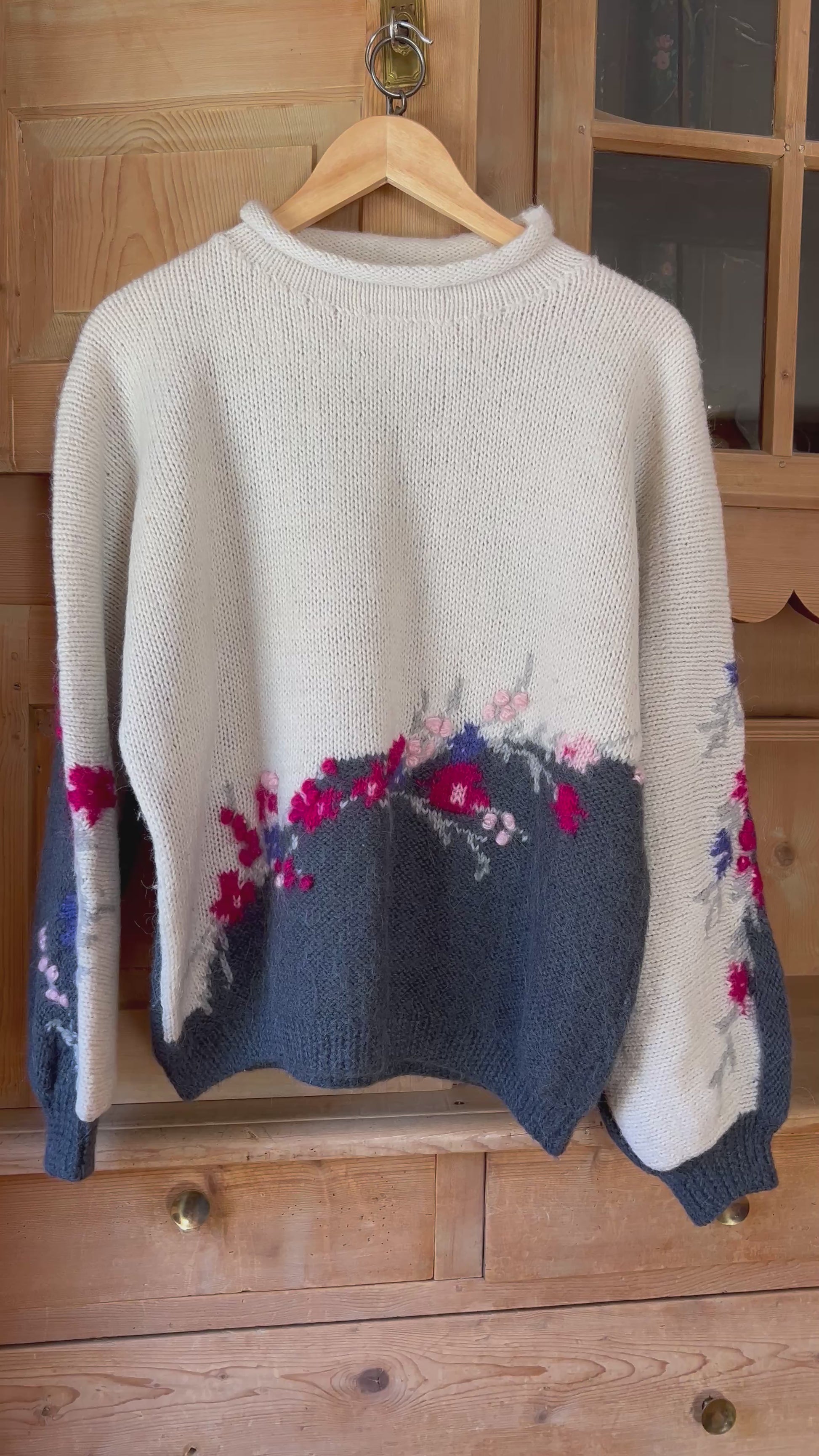 Hand knitted jumper. It features floral motif embroidery and wide sleeves.