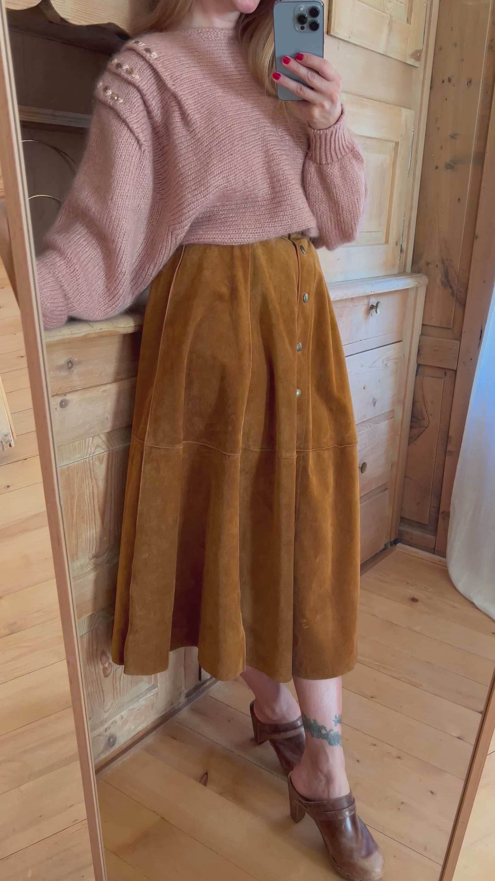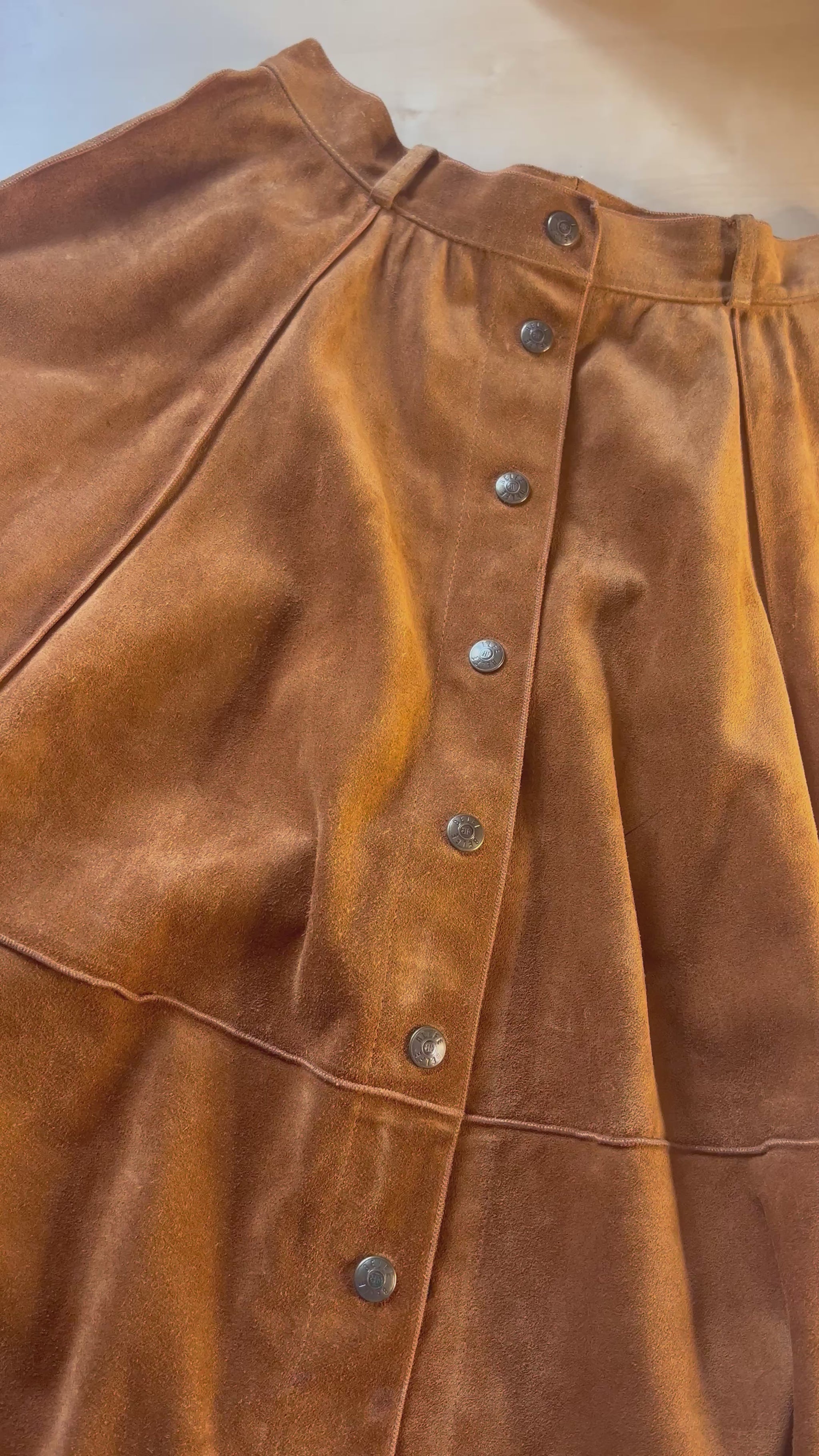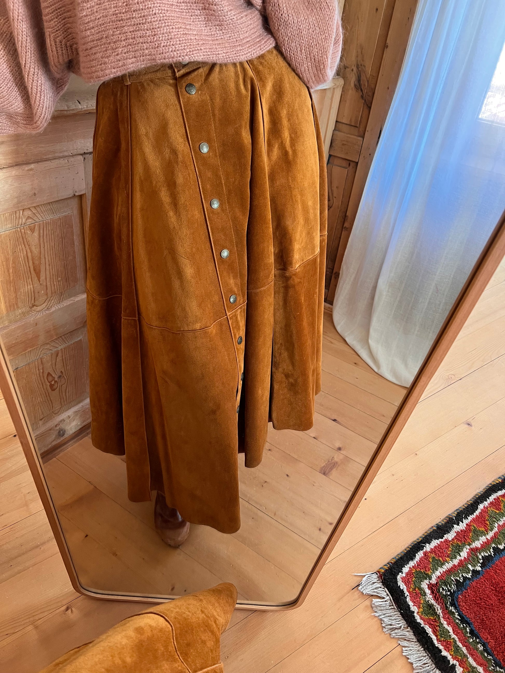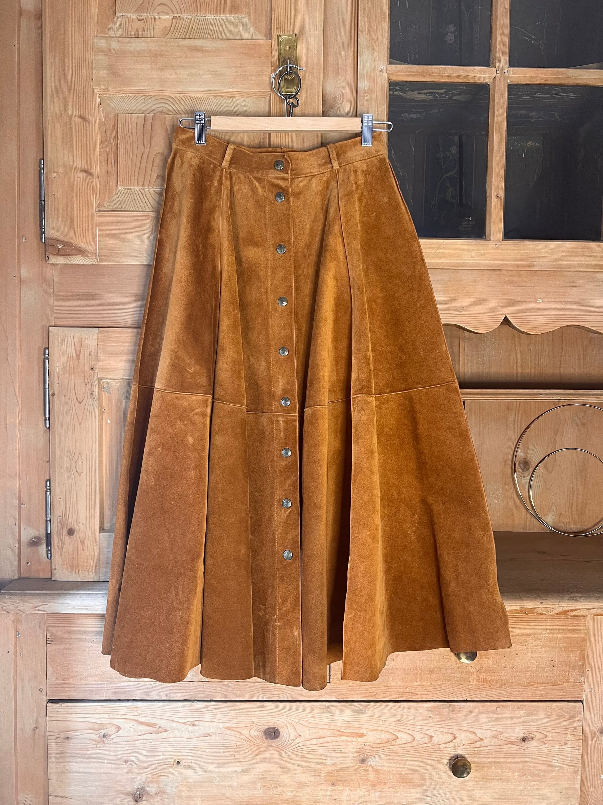 Stunning suede skirt. Buttons in full length, great craftsmanship, flattering and timeless silhouette.
