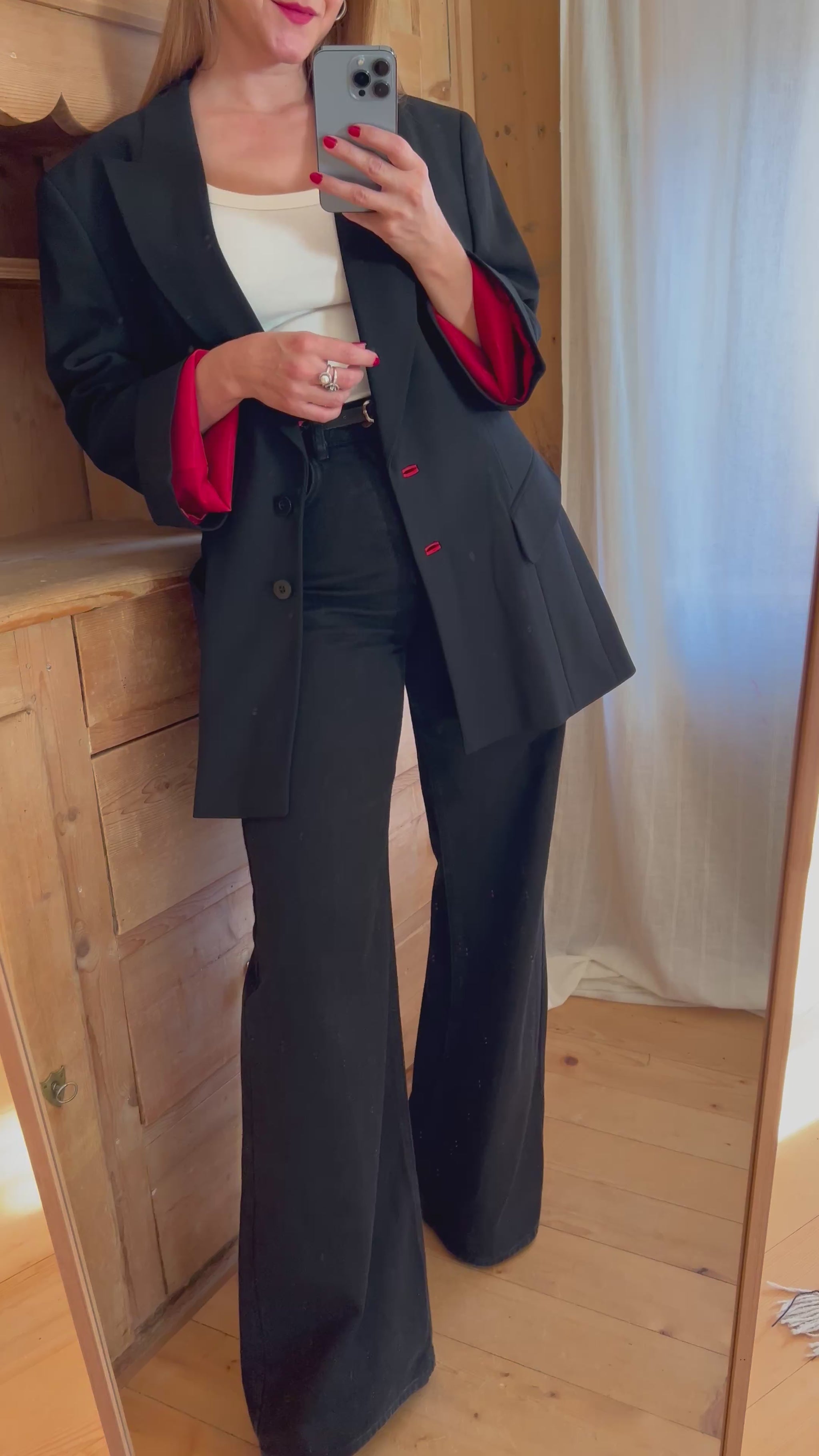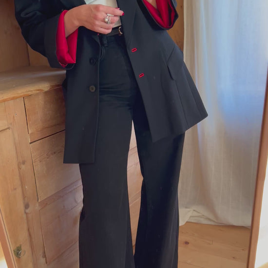 Vintage Escada blazer in black with stunning red lining. It features two front pockets and subtle bell sleeves.