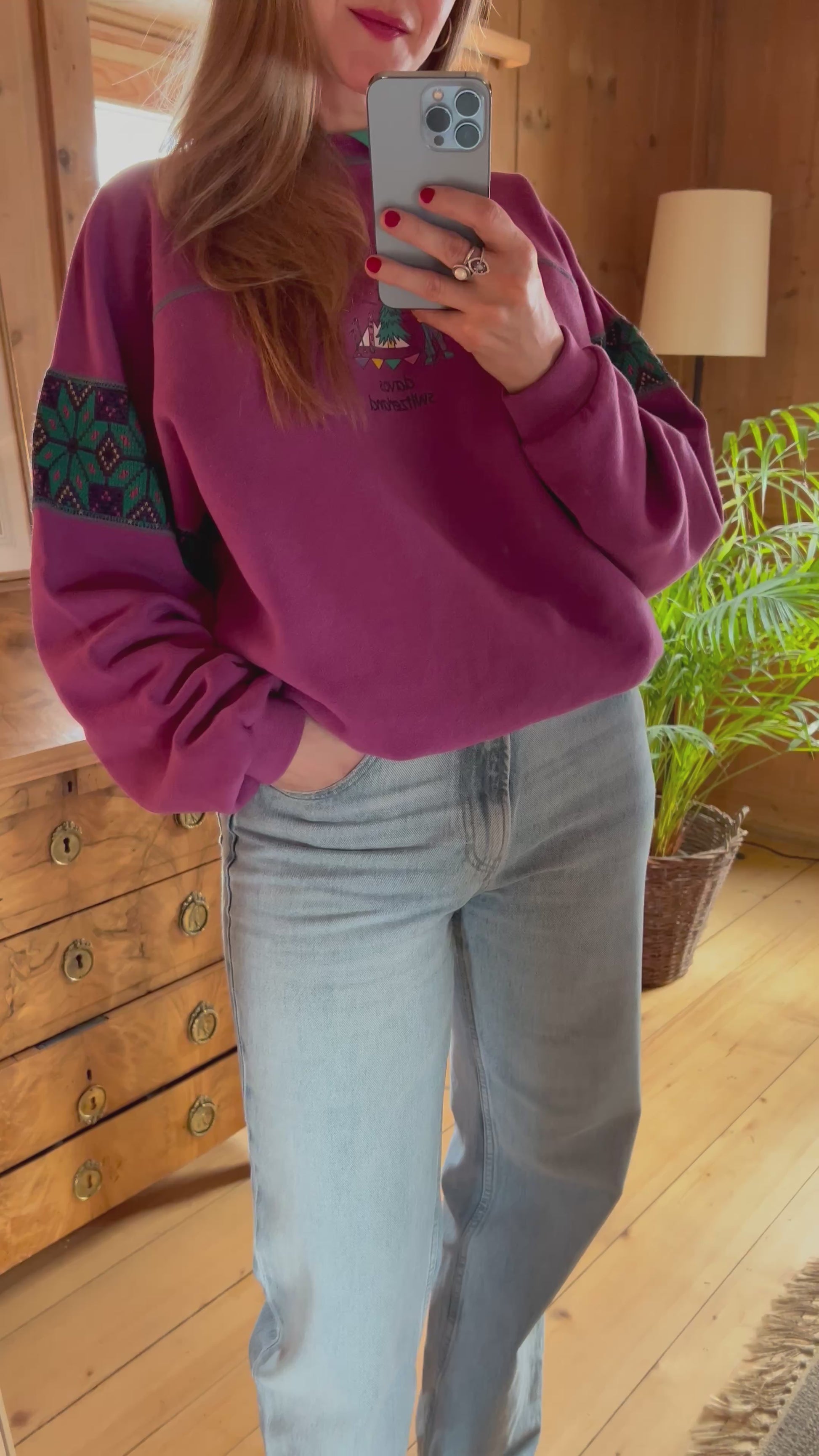 Vintage sweatshirt in purple with green collar and adorable illustration.