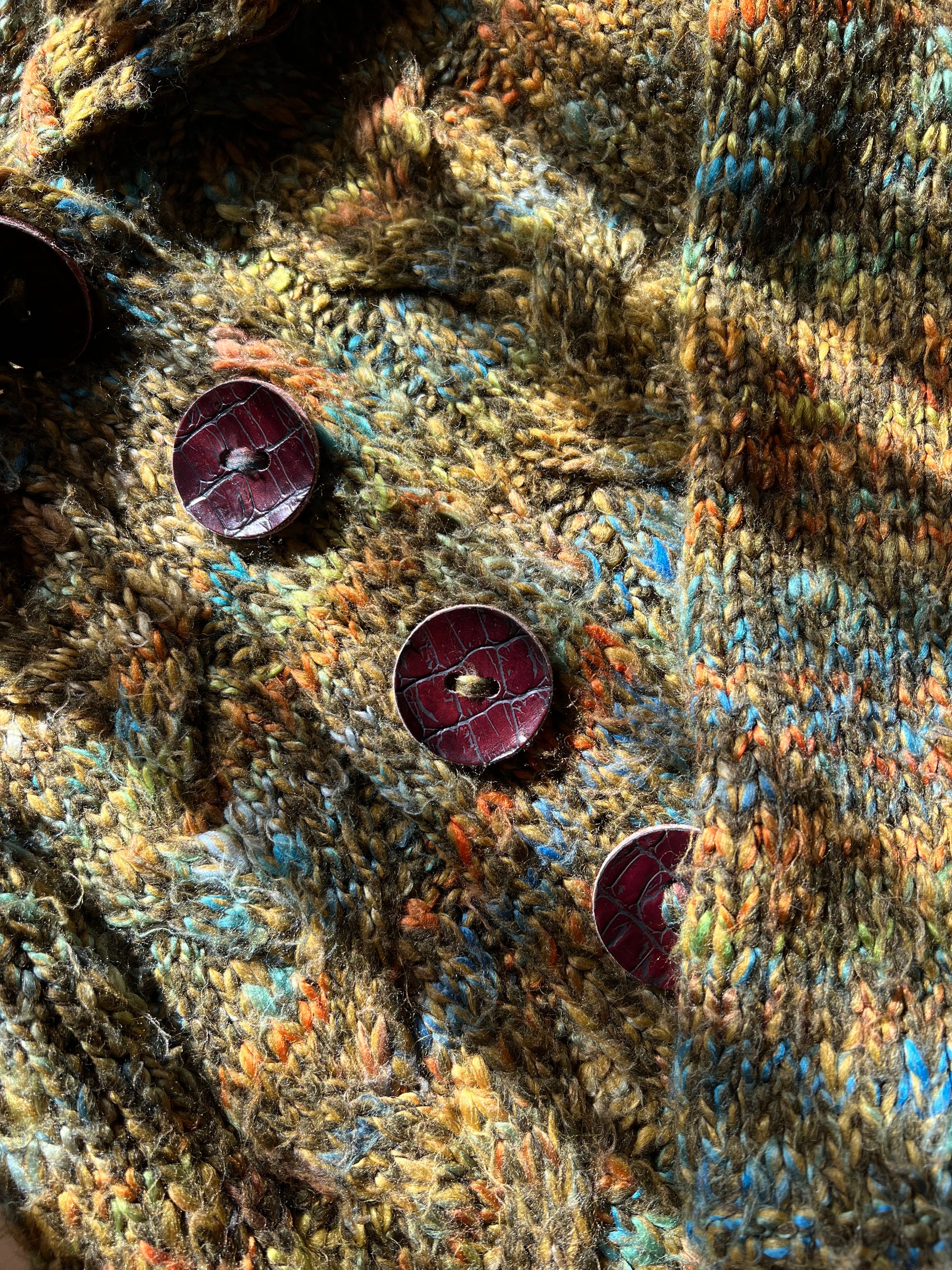 Y2K vintage cardigan. It features high collar and eye catching buttons.